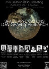 Besides the exciting lineup of invited speakers who will present during this mini-session and a lunch with a NASA astronaut during which ISS opportunities will be discussed, we offer to highlight posters and presentations related to space applications and low-gravity research within all abstracts submitted to the SoR meeting. Highlight your abstract as part of this topic during submission.